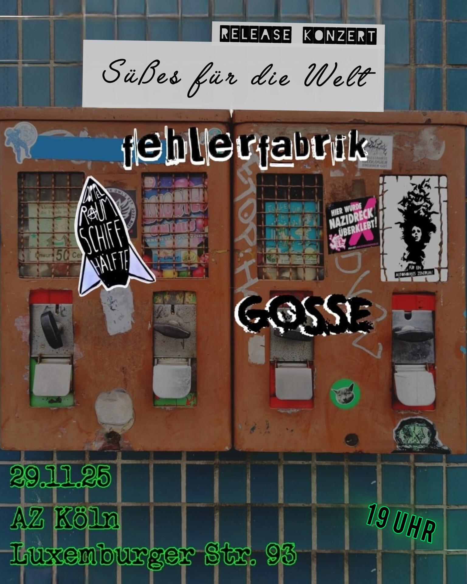 Fehlerfabrik (Punk/Köln) veröffentlichen ihre LP „Süßes für die Welt“ und wollen das mit einem Konzert und mit euch feiern. Es spielen außerdem Gosse (PunkHardcore/Aachen) und Doppelraumschiffhälfte (Synthpunk/Köln) und sorgen für einen zuckersüßen Abend voller Liebe, Wut und Deutlichkeit.