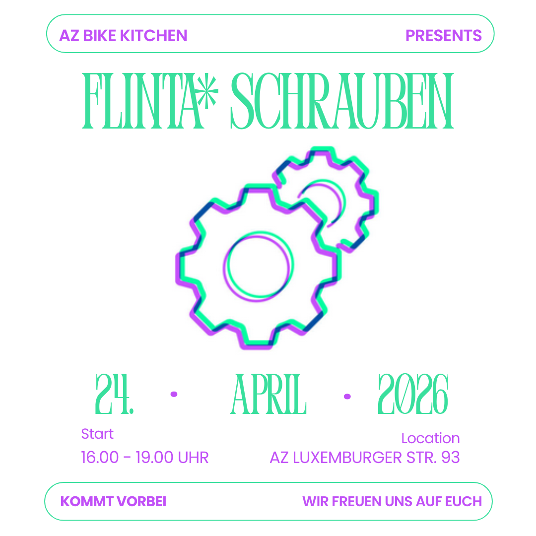 Pack deinen Drahtesel und deine FLINTA* friends ein und kommt vorbei zum FLINTA* Schrauben in der Bike Kitchen! Es sind keine Vorerfahrung notwendig! Bring einfach dein Rad mit und Lust, es selbst zu reparieren, wir helfen uns gegenseitig.